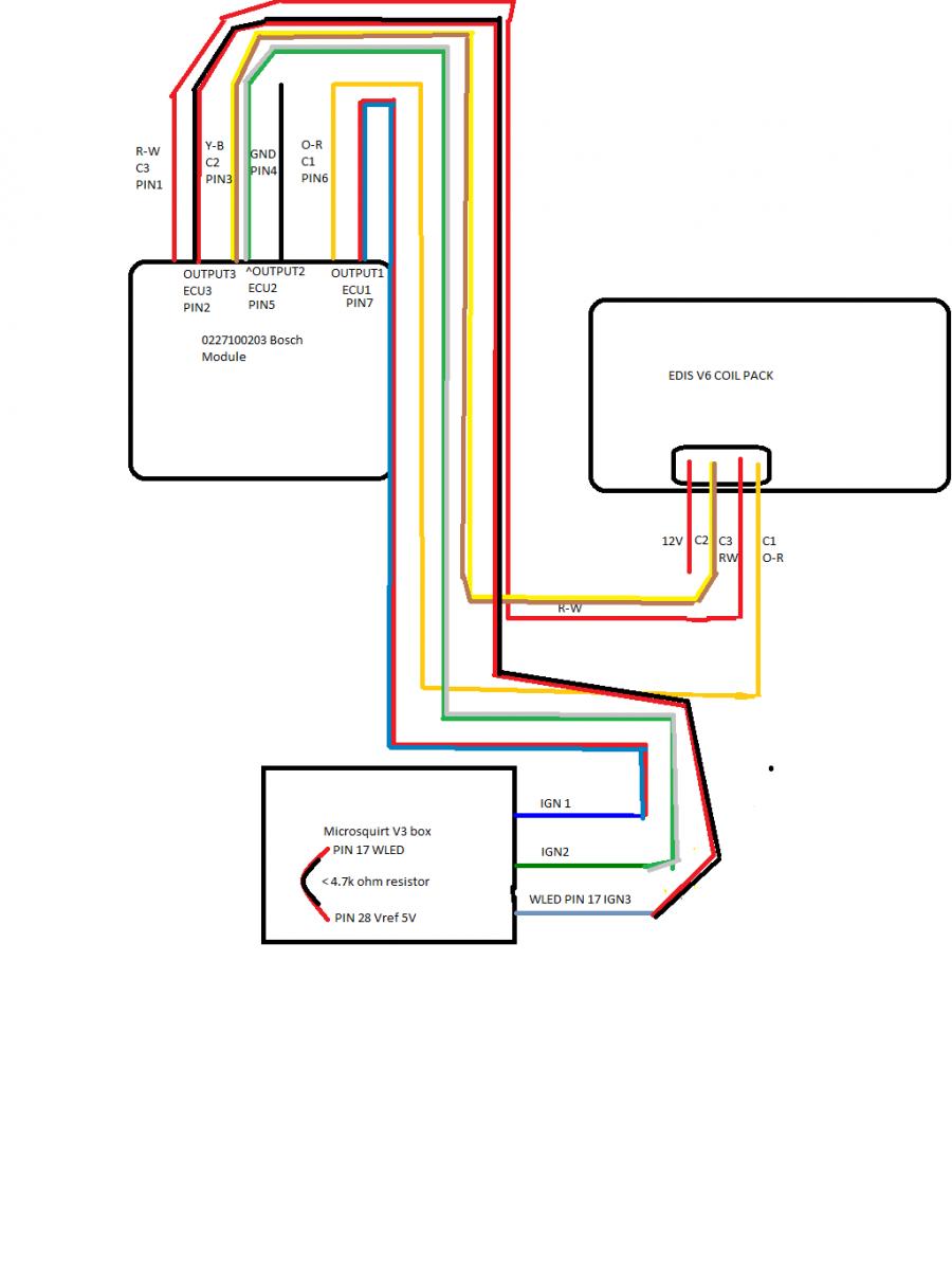 Well after alot of discussion with other people i know,we all came up to agree with what the below diagram will work for sure with microsquirt v3.I needed a total of 3 channels and i didn't know this till a few days ago then i made this diagram up and figured it out.Should work with no problems.Guy with a T6 made 470whp on a turbo 6 cylinder in a 240 volvo with the same combo im going to be using expect he was running MS2.