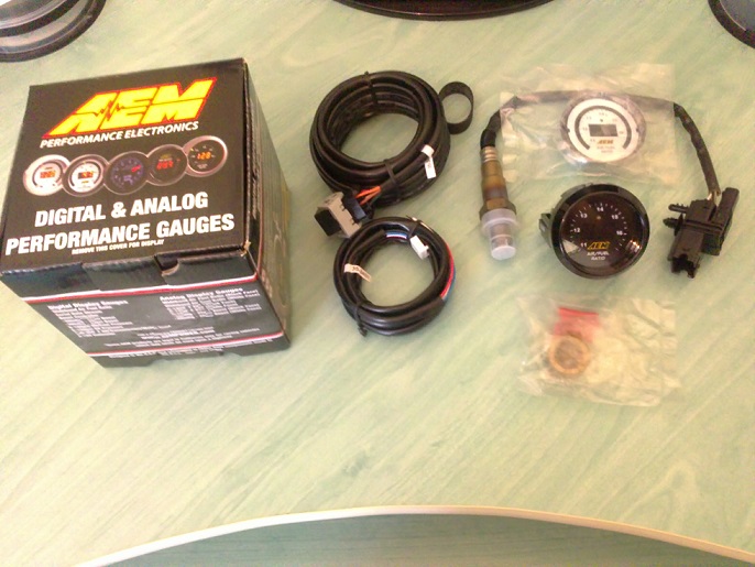 AFR monitoring is a must, so I've procured the AEM package, complete with a wideband sensor. Cloned the bung from the wideband so I could also fit the car's narrowband original O2 sensor, placed them both after the turbo (rule of thumb, distance would be about ten times the diameter of the downpipe) and fitted the gauges.