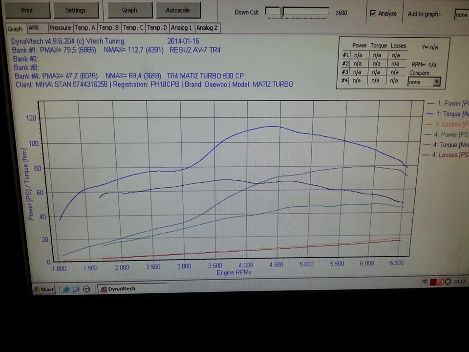 With that said, below you can see a graph of the highest run the car has put out on the bench, compared to a stock Daewoo Matiz (not mine, since it was almost never stock ). The guys fiddled a little bit with the fuel pump and the car ended up leaving the shop with a more conservative tune (about 78bhp and 110 NM torque), just to be on the safe side. All in all, roughly two thirds increase from the original specs seems like a great deal with such low boost, the only thing left to upgrade now is the clutch, as it gives in at peak torque and its making the car lose precious time when shifting gears.